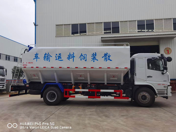 散裝飼料運輸車主要用于從飼料廠向畜牧場養(yǎng)禽場及飼料加工用戶運輸散裝飼料成品或飼料生產(chǎn)原糧,同時它也可用來運輸某些無腐蝕性粉粒狀原料,如制藥廠粉料和糧庫周轉(zhuǎn)。散裝飼料車的飼料罐架設(shè)在卡車的底盤上,罐頂開有進料口.頂部的一根螺旋輸送卸料管(俗稱卸料絞龍)則可自由回轉(zhuǎn)和抬升,抬升的仰角可達60度。運輸時,頂部的螺旋管平臥在罐頂;卸料時則抬起,使管端的出料口與畜禽飼養(yǎng)場貯料罐頂部的進料門相接,駕駛室內(nèi)裝有操縱裝置(操縱裝置也可裝置在罐體尾部),卸料時通過車底的動力輸出軸和減速器來驅(qū)動螺旋,以完成卸料。目前國內(nèi)主要推出3T、5T、8T、11T、15T和22T等多個噸位車型。