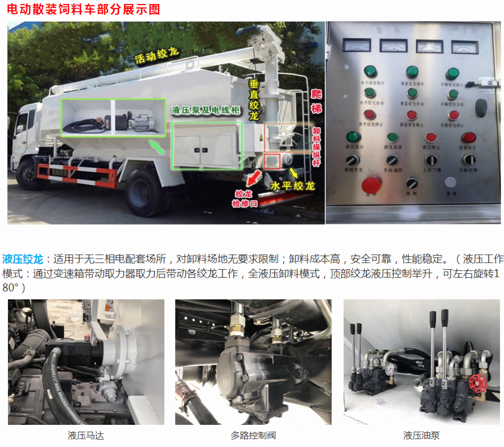 用進口液壓配件。使用電動絞龍需外接380V電源,或加裝車載發電機。電動系統采用西門子電機,液壓馬達液壓