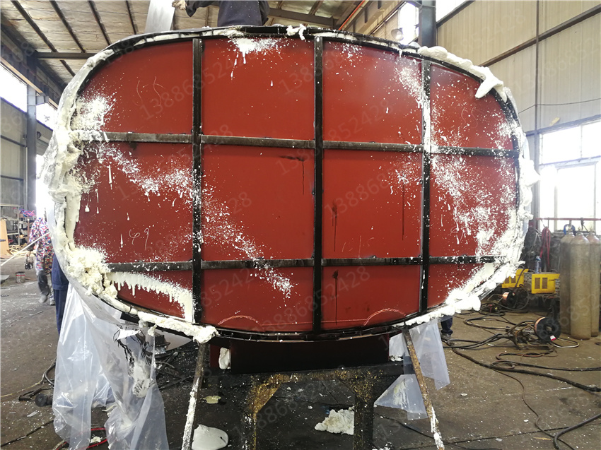 3. 保層溫的制作是在水罐外部另外焊接10mm厚的支撐骨架,然后用保溫材料將骨架內部填充滿,**在骨架外蒙上一層外皮。 保溫層外表鐵皮采用8mm厚高強度耐磨板,可選擇使用不銹鋼分鏡面8K或磨砂板