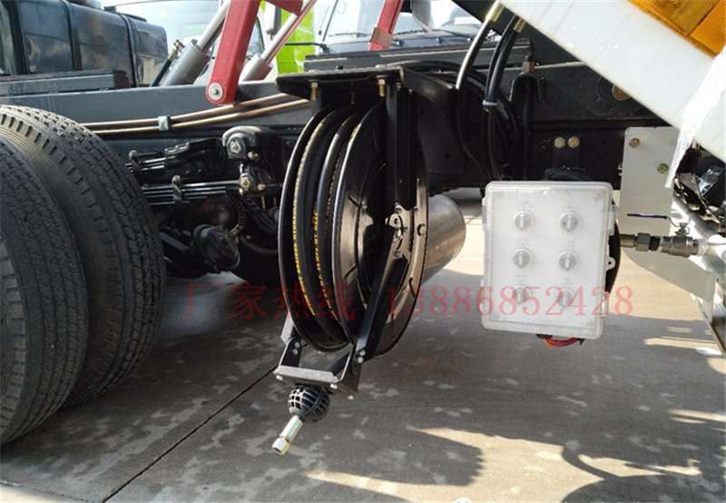 洗掃車右后側裝有機械式自動卷繞沖洗卷盤,配 17m 高壓軟管,可用于清行車身和其 他需要清洗的地方。手持不銹鋼噴槍配快速接 頭,能方便地與沖洗卷盤連接或脫開,產生的 高壓水流可輕松沖去路邊小廣告。