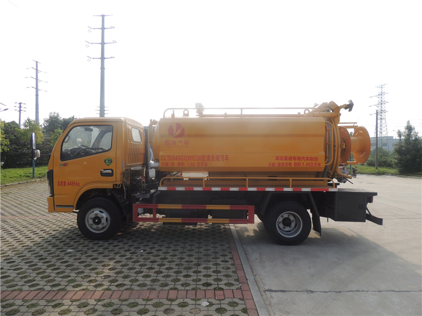 東風5方清洗吸污車,藍牌管道疏通車,抽排運污車,糞便液態吸糞車,泥漿液態轉運車,該車用于下水道排污及疏通,專用裝置:罐體及清洗吸污裝置;罐體外形尺寸(直段長×直徑)(mm):3100×1300(前部1370mm為清水罐,后部1730mm為污水罐);污水罐總容量:1.96立方米,污水罐有效容積:1.86立方米,介質:液態污物,密度800千克/立方米;清水罐總容量:1.56立方米,清水罐有效容積:1.49立方米,介質:,密度1000千克/立方米,清水罐和污水罐為獨立罐體,清洗功能時用清水罐,吸污功能時用污水罐,污水罐和清水罐不可同時滿載;ABS型號/廠家:ABS/ASR-12V-4S/4M/襄陽東風隆誠機械有限責任公司;卸料方式為舉升后卸式;側、后防護材料均為:Q235碳鋼,連接方式均為:螺栓連接,后部防護截面尺寸(mm):120×50,后部防護離地高度(mm):370.隨底盤選裝駕駛室,選裝底盤附件安裝位置.選裝燃油箱,電瓶,尿素罐,儲氣筒左右安裝位置